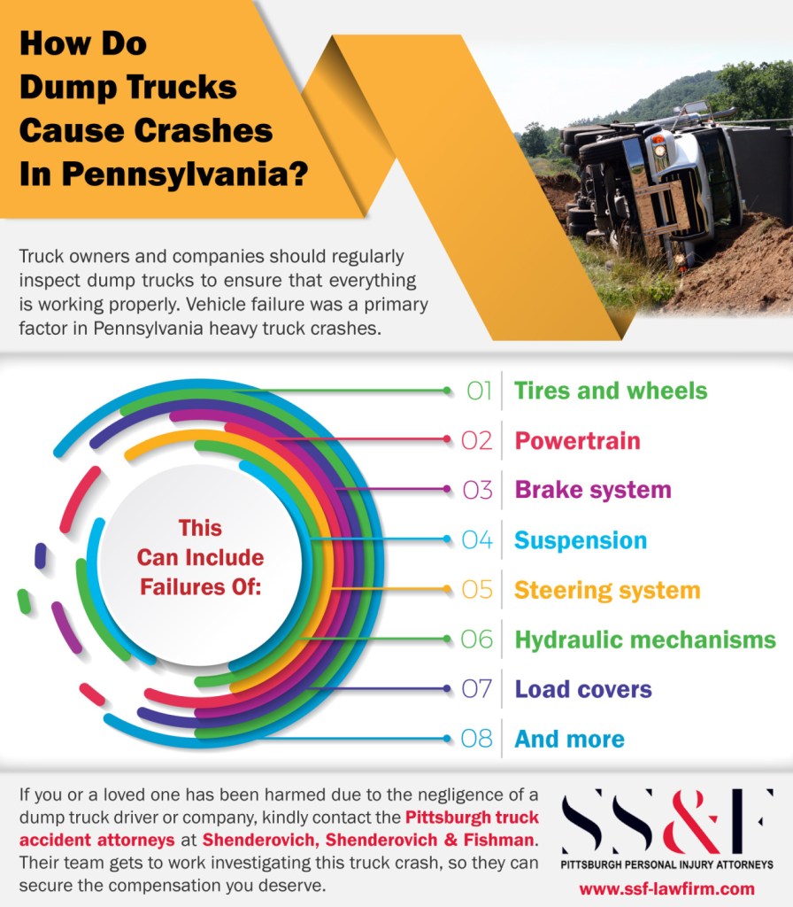 Truck owners and companies should regularly inspect dump trucks to ensure that everything is working properly. Vehicle failure was a primary factor in Pennsylvania heavy truck crashes. If you or a loved one has been harmed due to the negligence of a dump truck driver or company, kindly contact the Pittsburgh truck accident attorneys at Shenderovich, Shenderovich & Fishman. Their team gets to work investigating this truck crash, so they can secure the compensation you deserve.