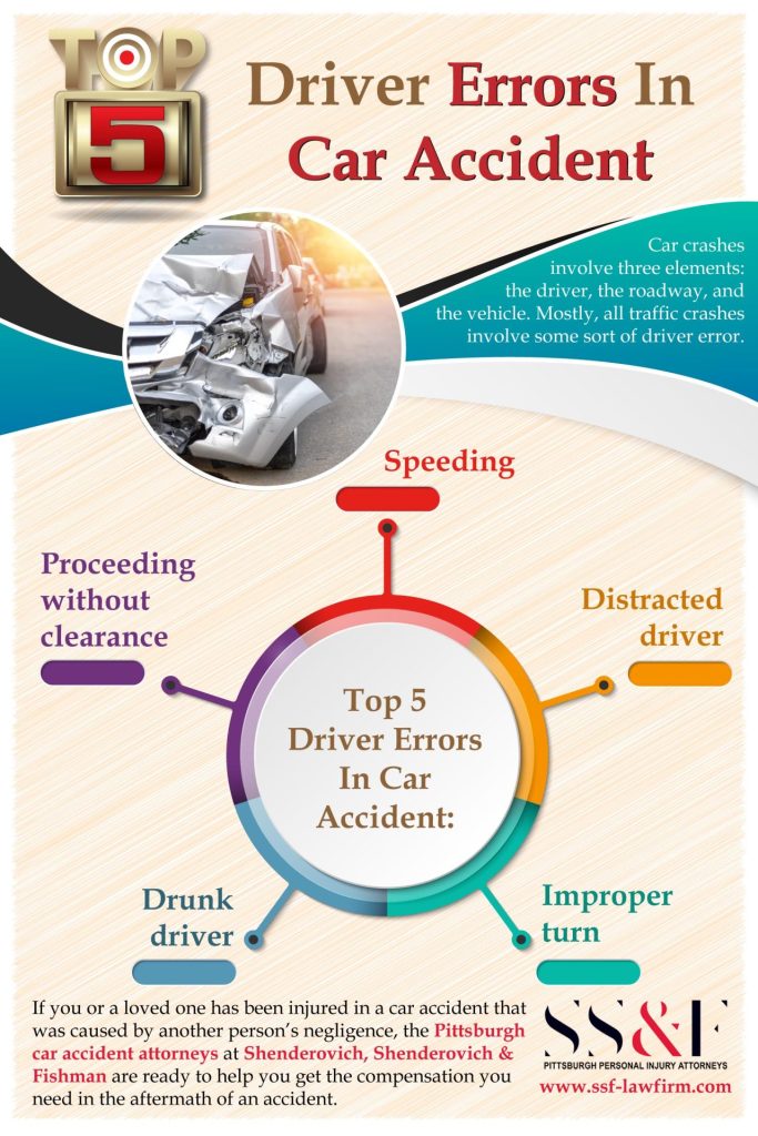 Car crashes involve three elements: the driver, the roadway, and the vehicle. Mostly, all traffic crashes involve some sort of driver errors like, speeding, distracted driver, improper turn, drunk driver, proceeding without clearance. If you or a loved one has been injured in a car accident that was caused by another person’s negligence, the Pittsburgh car accident attorneys at Shenderovich, Shenderovich & Fishman are ready to help you get the compensation you need in the aftermath of an accident.
