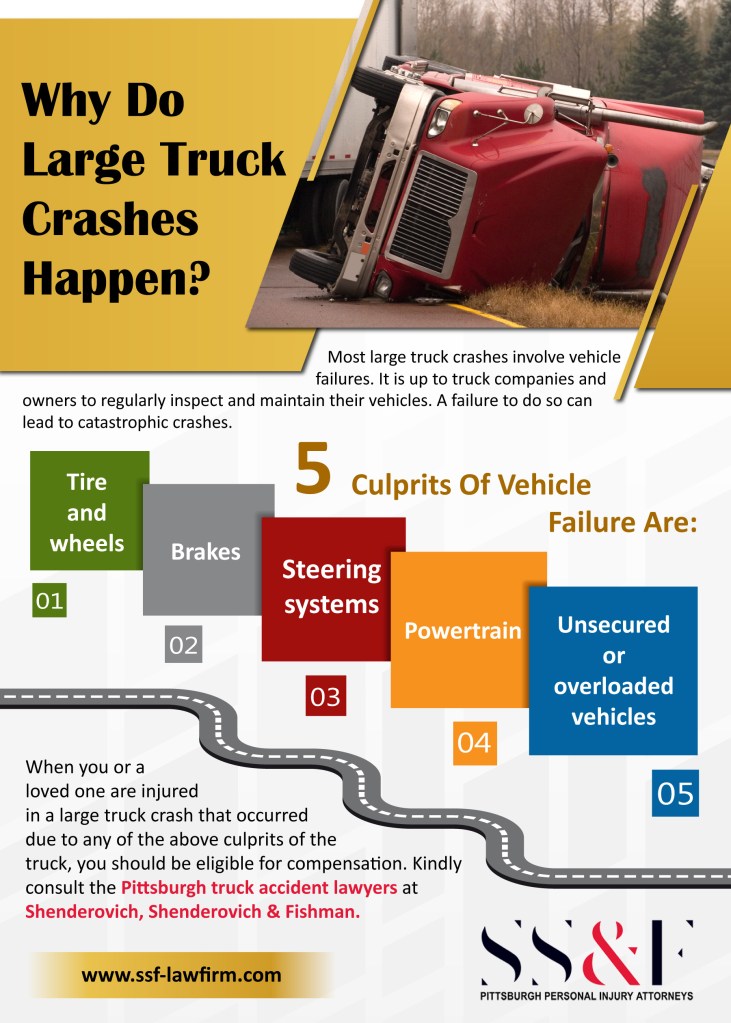 Most large truck crashes involve vehicle failures. It is up to truck companies and owners to regularly inspect and maintain their vehicles. A failure to do so can lead to catastrophic crashes. When you or a loved one are injured in a large truck crash that occurred due to any of the above culprits of the truck, you should be eligible for compensation. Kindly consult the Pittsburgh truck accident lawyers at Shenderovich, Shenderovich & Fishman.
